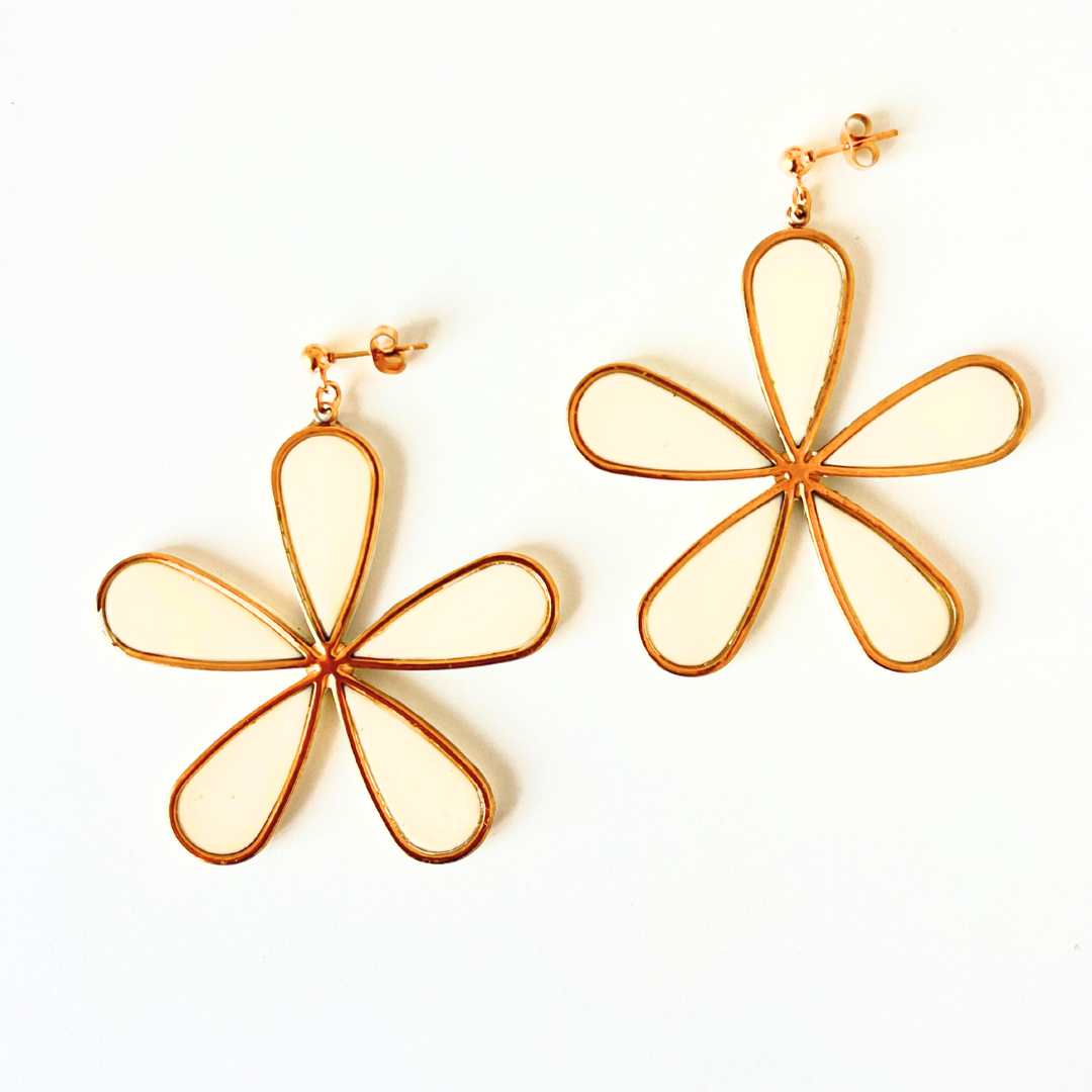 Estos pendientes combinan el encanto artesanal de la arcilla polimérica cubierta de resina con la durabilidad del acero inoxidable. Su diseño floral grande y liviano ilumina el rostro y aporta un toque alegre, ideal para bodas, eventos especiales o looks de verano.