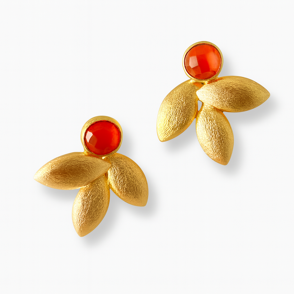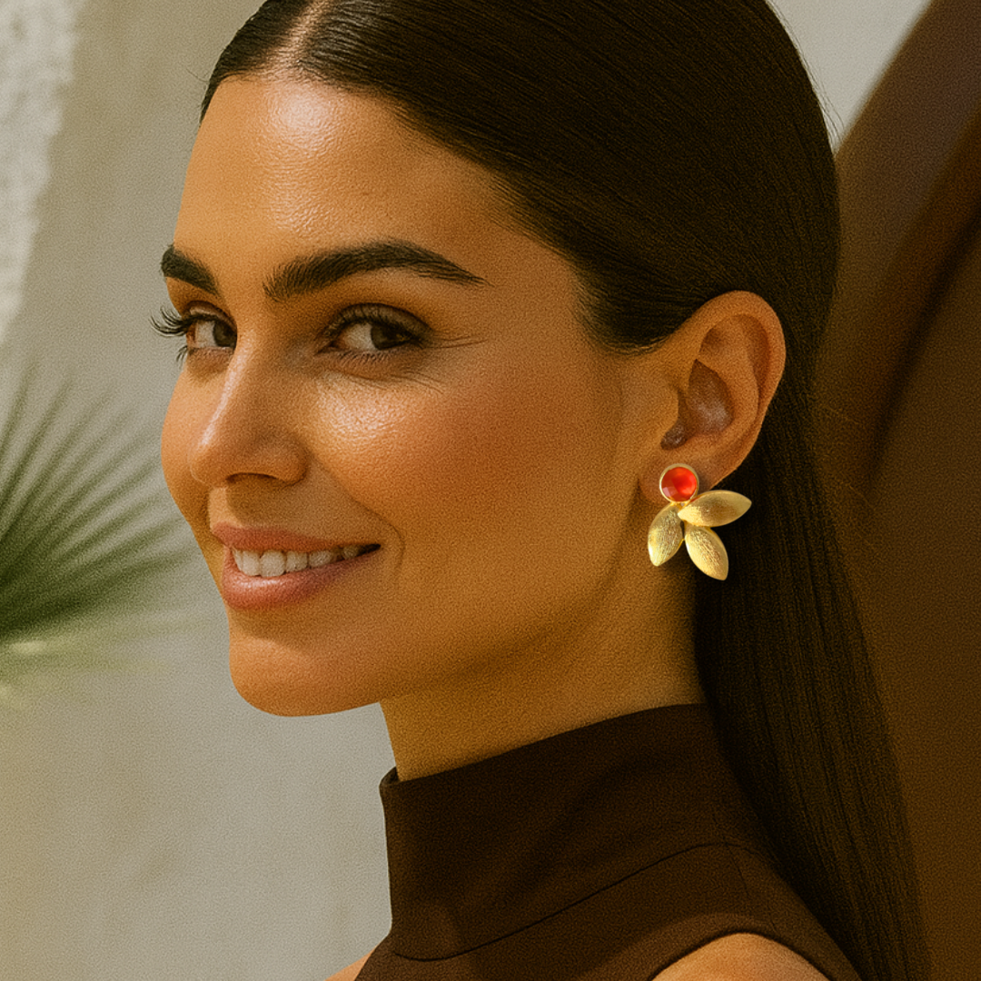 Los pendientes Jimena destacan por su diseño dorado en forma de hojas texturizadas, realzado por una piedra coral facetada que aporta vitalidad y elegancia. Un accesorio atemporal que transforma cualquier look, desde un vestido de invitada hasta un outfit de fiesta sofisticado.