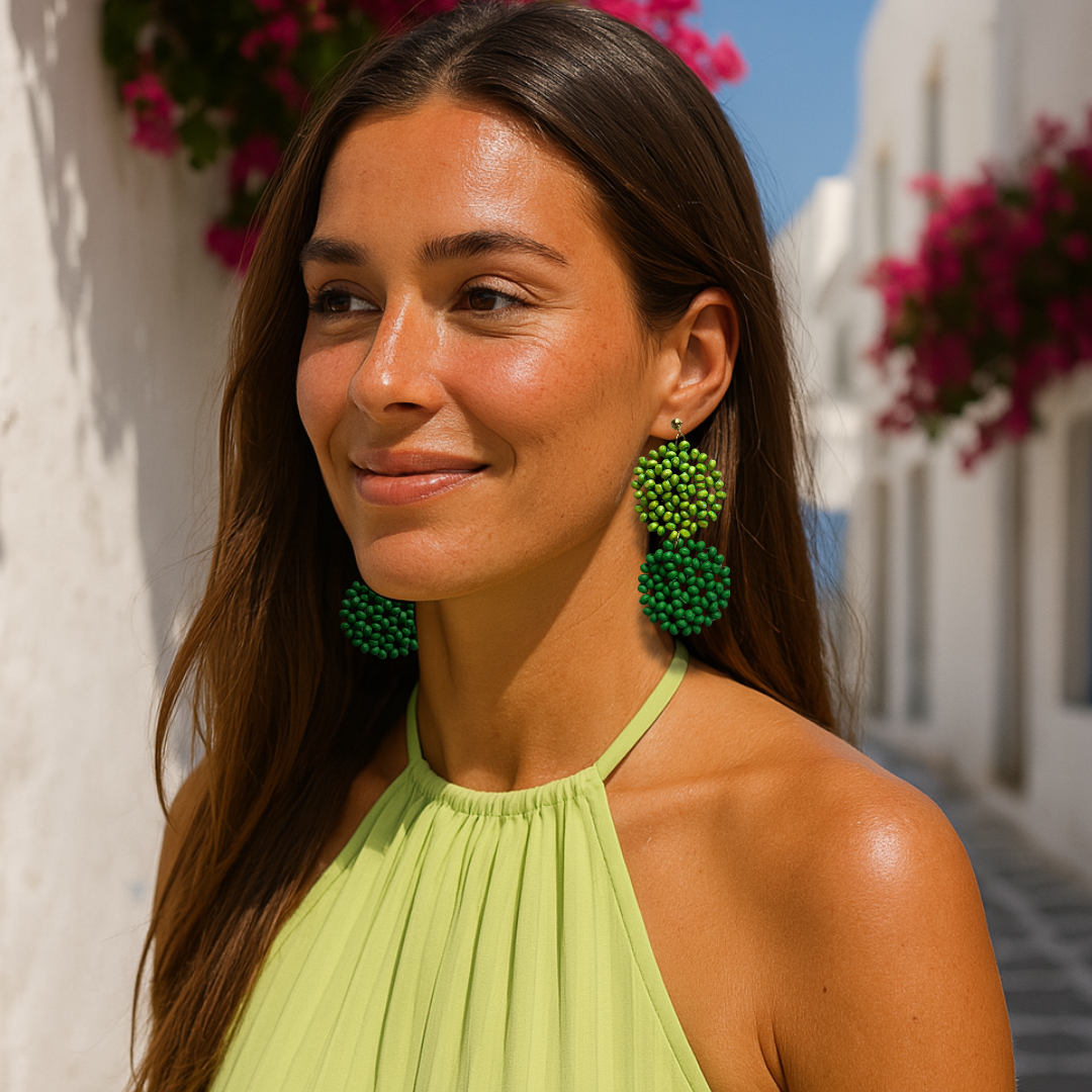 Los pendientes Kalea son puro carácter y energía. Su diseño de dos círculos superpuestos de bolitas verdes, vibrantes y frescos, es perfecto para quienes aman destacar con estilo. Son ideales para esos días en los que necesitas un toque de color que hable por ti.