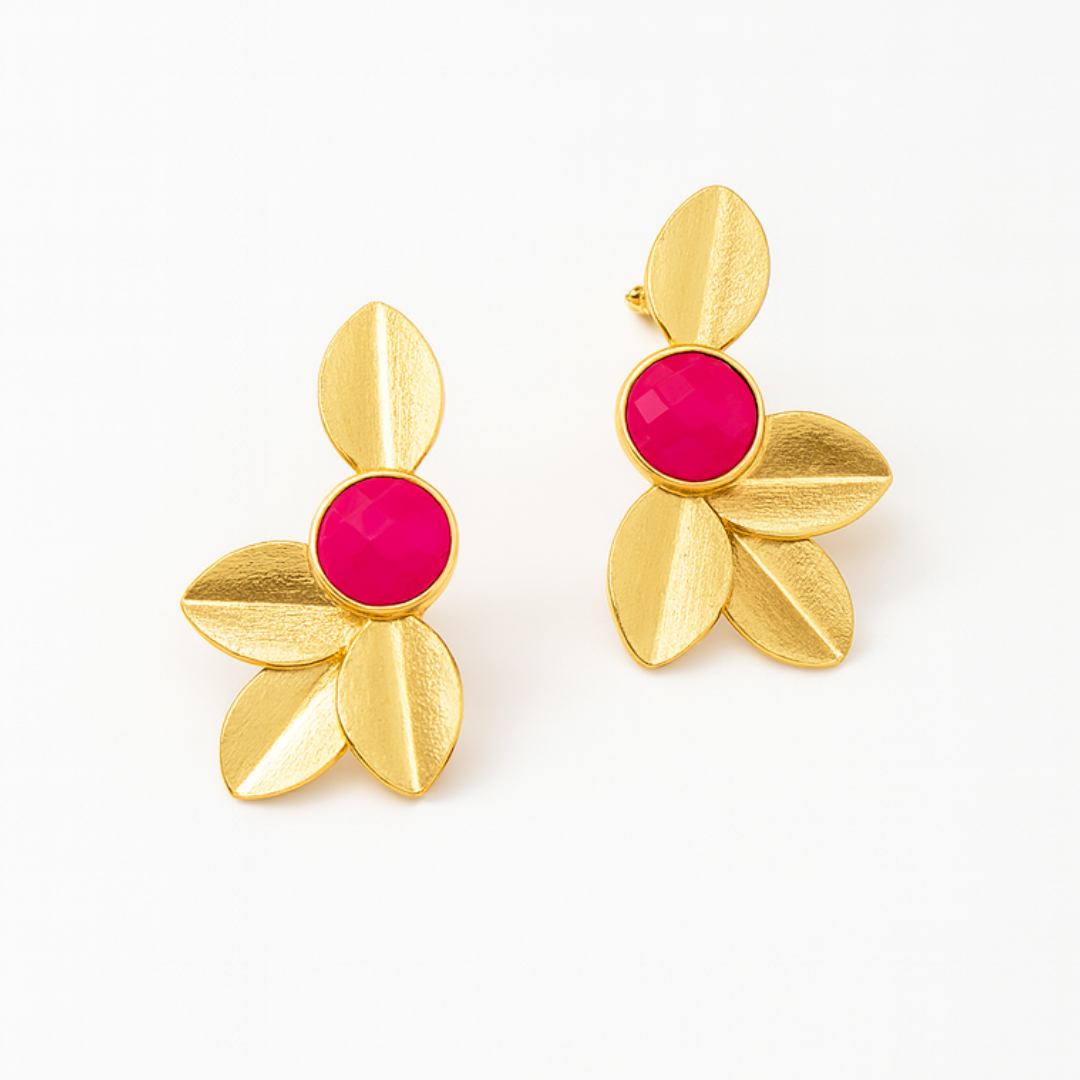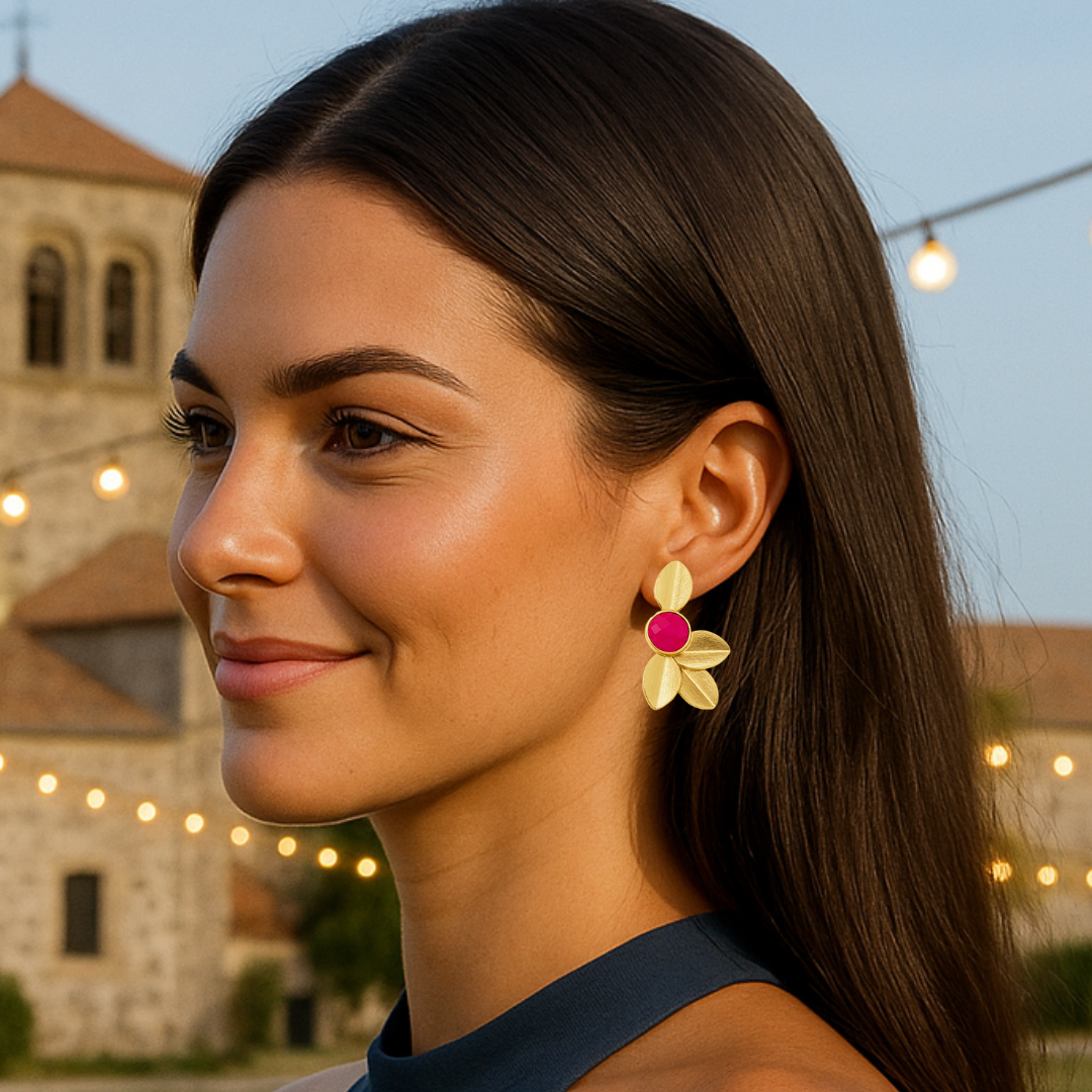 Los pendientes Matilda combinan la fuerza del dorado con la frescura de una piedra fucsia que ilumina cualquier look. Su diseño de hojas doradas con acabado mate resalta con la piedra central facetada, logrando un estilo único que eleva desde un outfit de invitada hasta un look de fiesta.