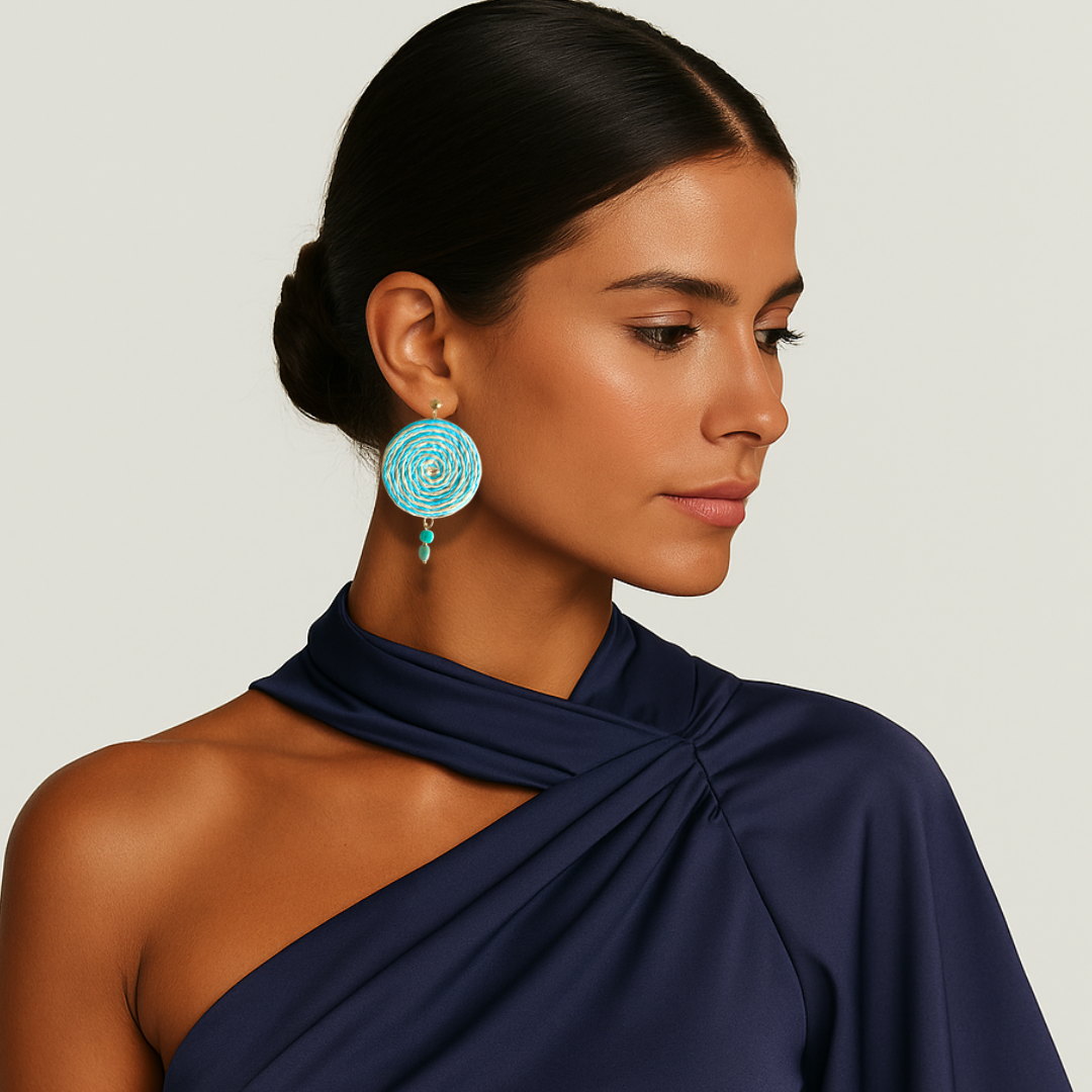 Los Pendientes Aoka combinan materiales naturales como la rafia, trabajados en espiral, con un toque de color en turquesa que evoca el mar, el verano y las ganas de celebrar.