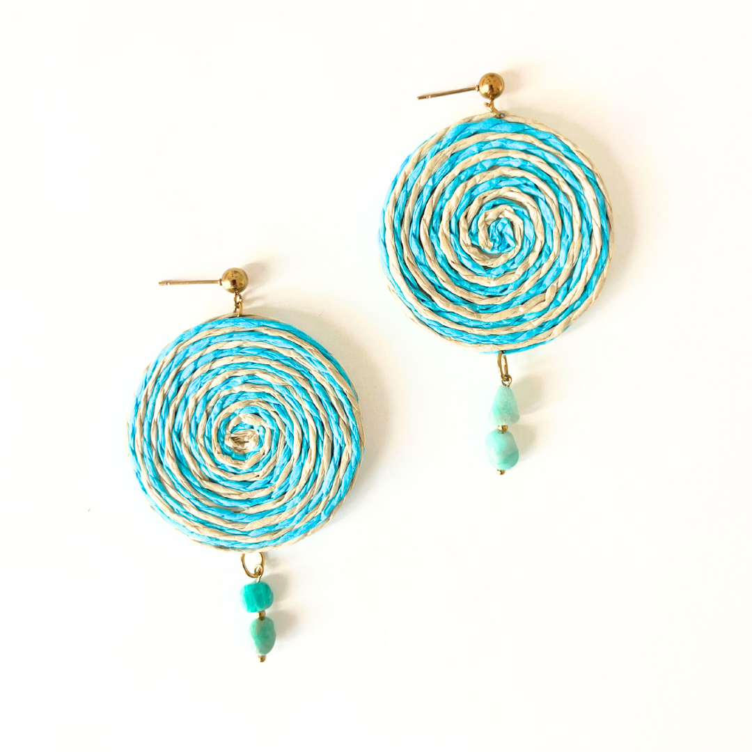 Confeccionados en rafia trenzada azul y beige, en forma de espiral, y rematados con cuentas en turquesa que aportan un movimiento ligero y fresco.