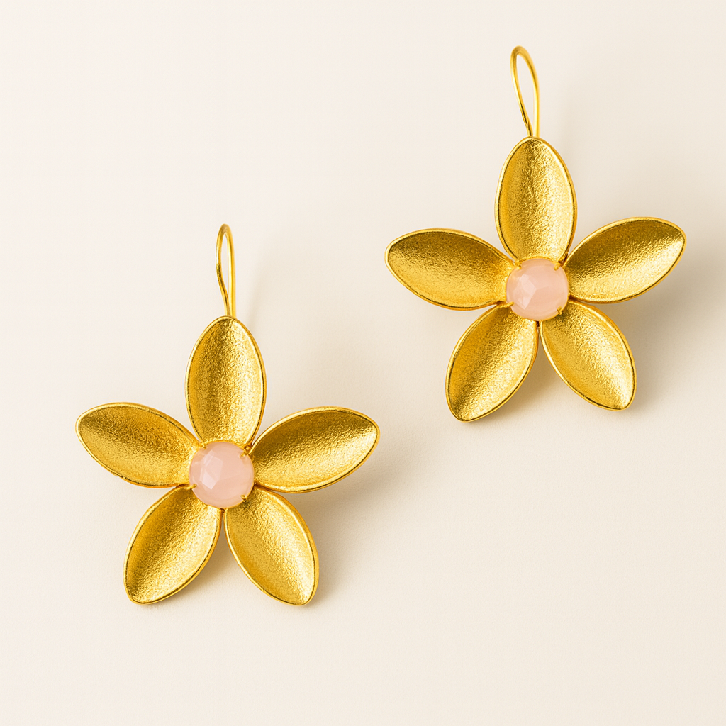 Los pendientes Flora tienen forma de flor dorada con un centro de piedra rosa. Son elegantes, delicados y perfectos para invitadas de boda, ferias o cualquier ocasión donde quieras brillar con elegancia natural.