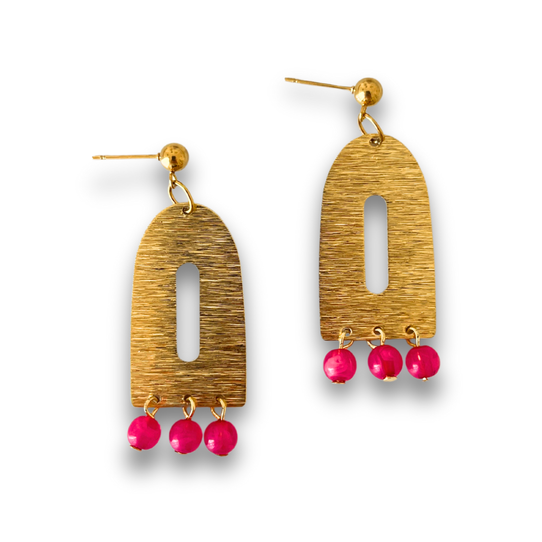 Los Pendientes Maika combinan formas geométricas con textura dorada y un toque vibrante en fucsia. Perfectos para quienes buscan accesorios diferentes, alegres y con intención.