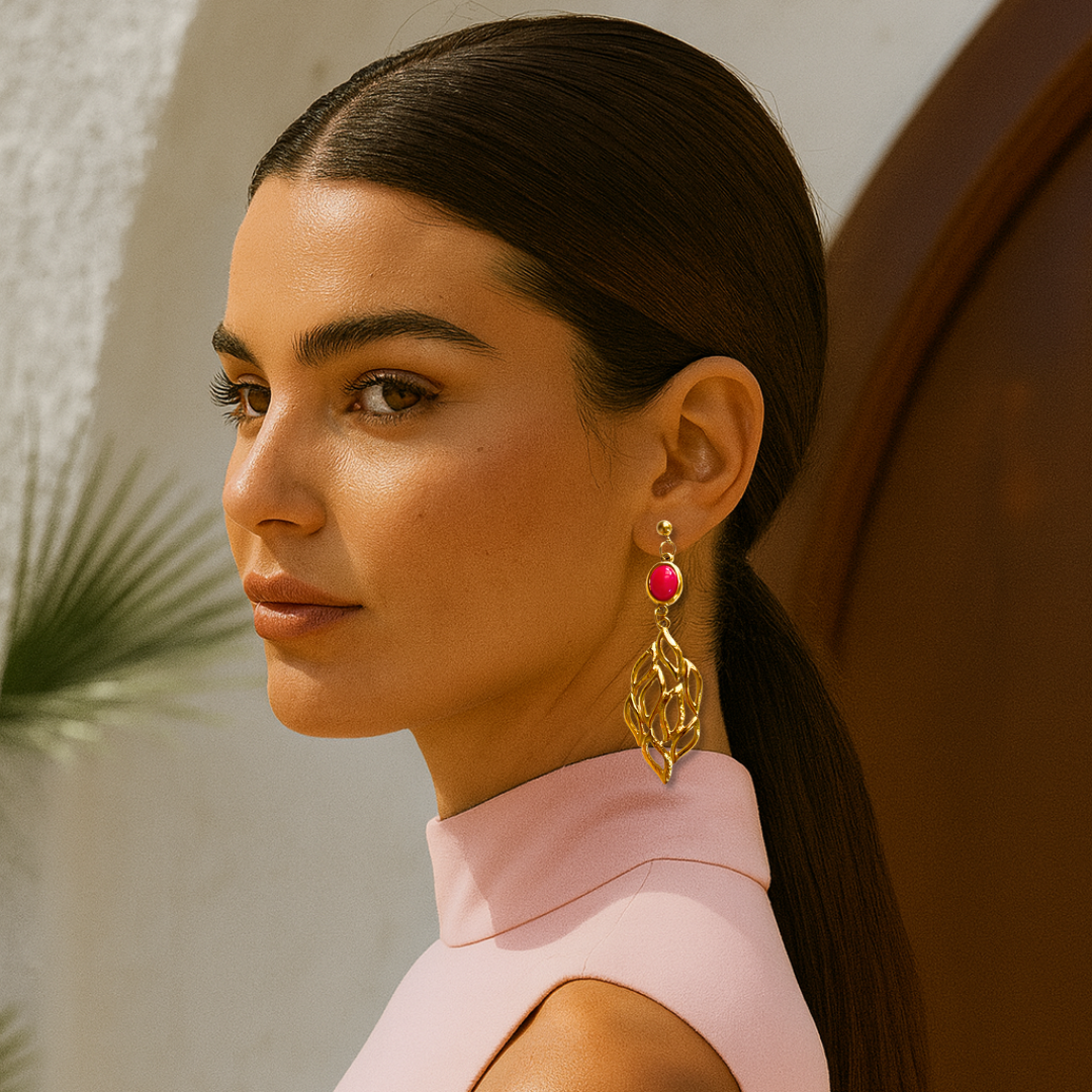 Los pendientes Valentina lo tienen todo: diseño dorado con movimiento, piedra de color en cinco tonos disponibles; buganvilla, fucsia, blanco, azul y lila y una presencia ligera pero elegante. Perfectos para bodas, eventos y estilismos flamencos modernos.